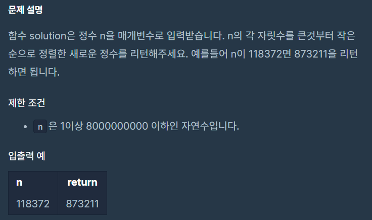 (프로그래머스 c++)정수 내림차순으로 배치하기 본문