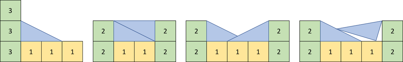 위의 그림의 가장 왼쪽부터 1번, 2번, 3번, 4번 예제라고 했을 때, 1번은 높이 차이가 1이 아니라서, 2번은 경사로를 바닥과 접하게 놓지 않아서, 3번은 겹쳐서 놓아서, 4번은 기울이게 놓아서 불가능한 경우이다.