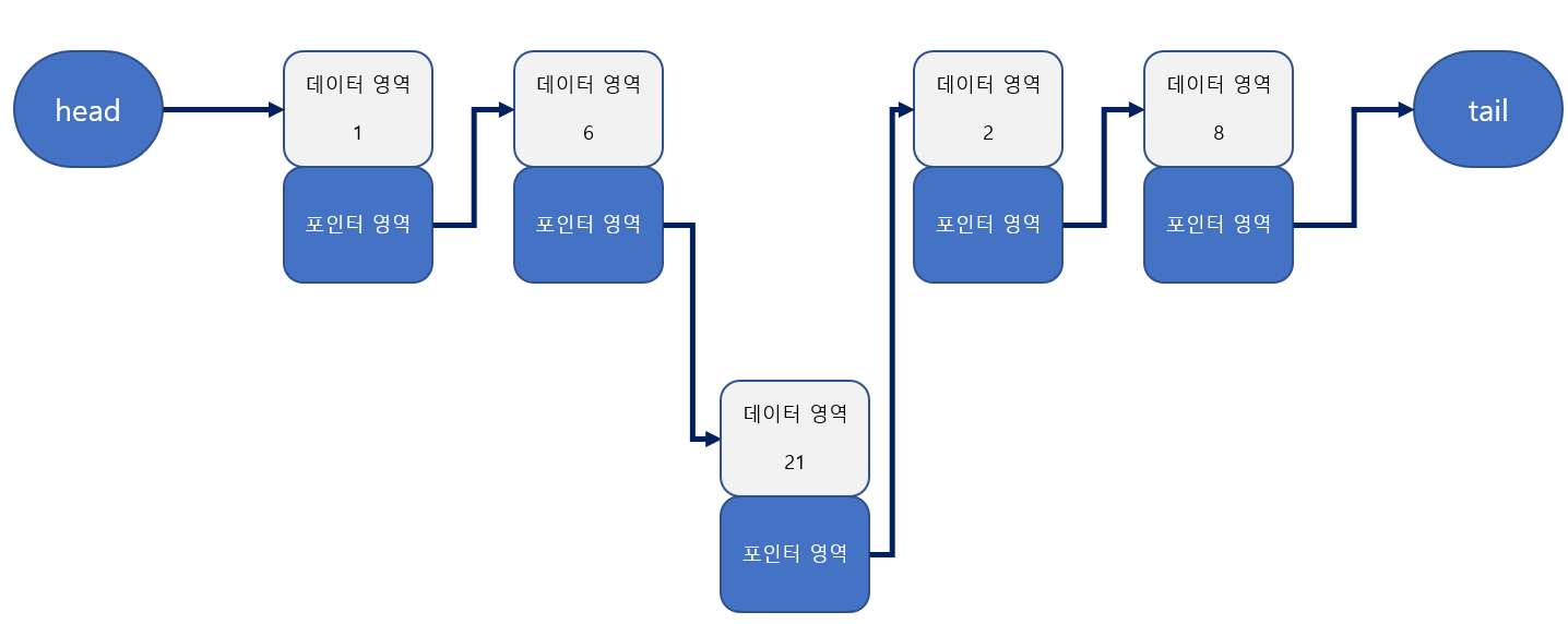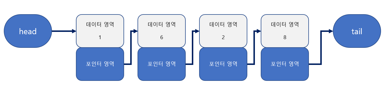 - 각 요소는 노드라고 부르며, 데이터 영역과 포인터 영역으로 구성된다.