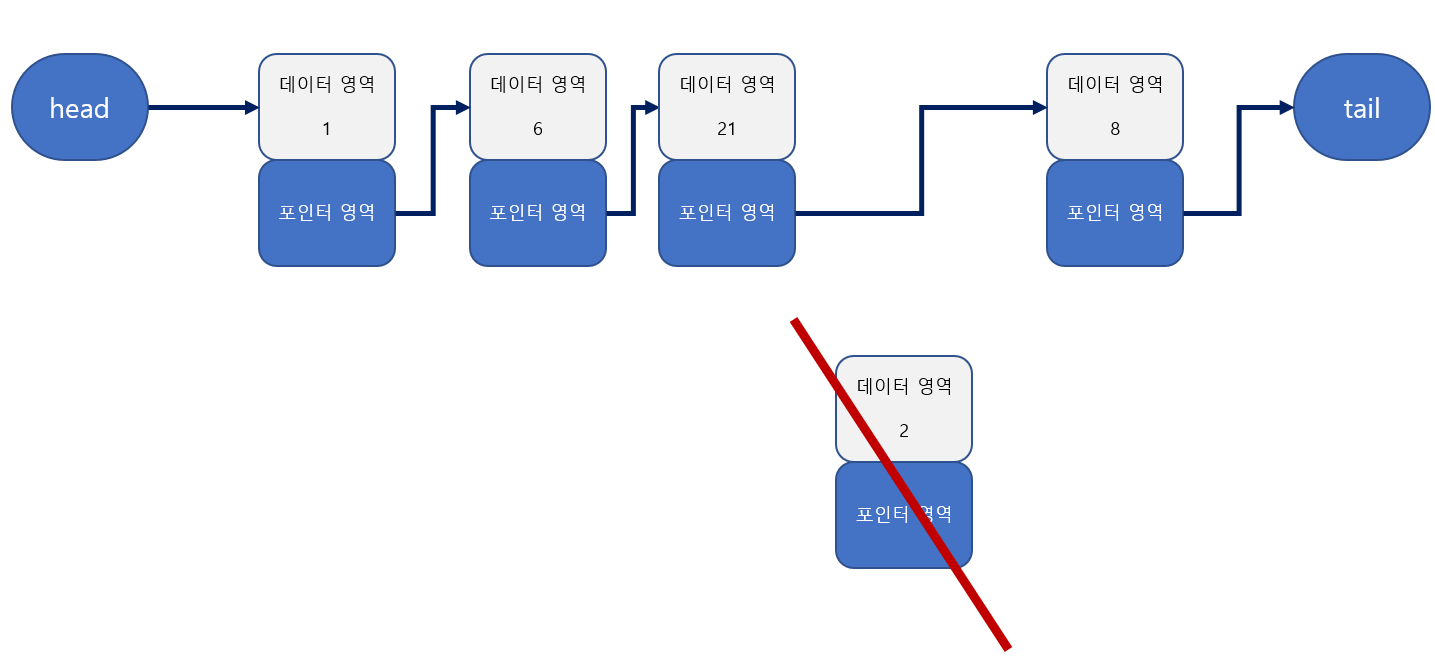 - 21의 포인터 영역을 2의 포인터 영역인 8로 이어준 후, 2를 삭제한다.
