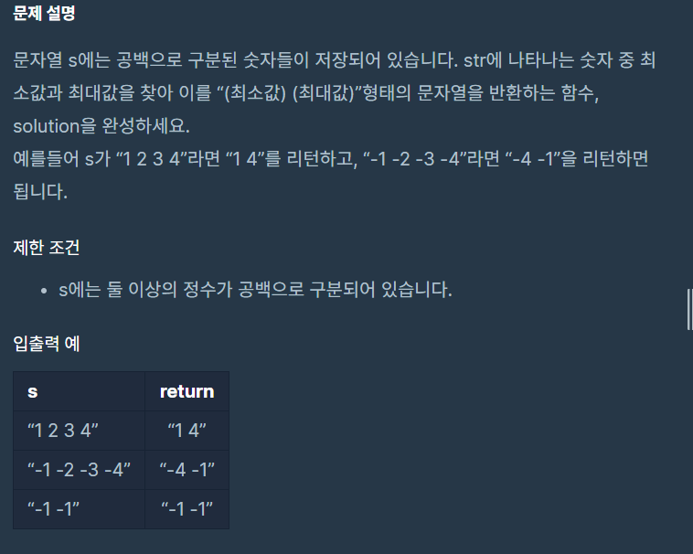 문자열로 들어온 값 중에서 최댓값과 최솟값을 찾아야 한다.