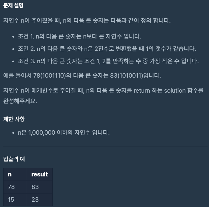 그리고 answer에는 n + 1을 넣어주고, n + 1을 bit로 바꾸었을 때 1의 개수가 count와 같은 것이