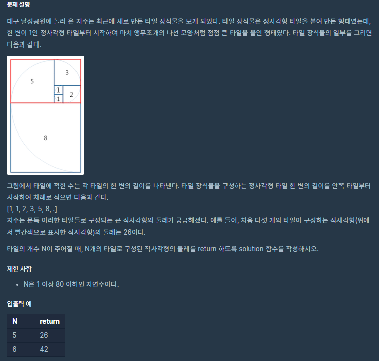 문제를 잘 읽다보면 타일의 한 변의 길이가 피보나치와 같이 증가하는 것을 알 수 있다.