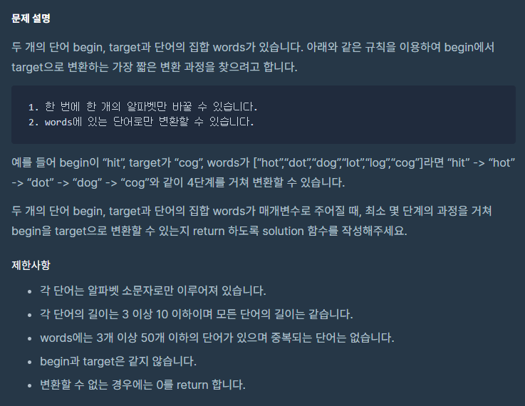 그리고 count를 이용하여 begin과 words[i]를 비교하여 한 개의 알파벳을 바꿀 수 있는지 확인한다.