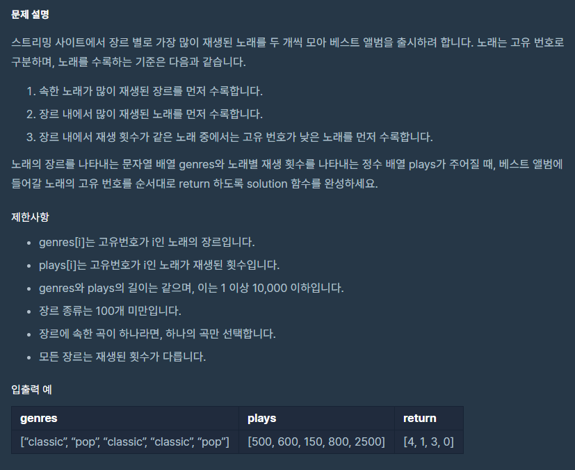 우선 모든 장르와 재생횟수, 총 재생 횟수를 for문을 통해 모두 다 넣는다.