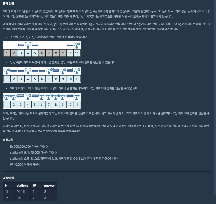 이미 설치되어 있기 때문에 start를 stations[index] + w로 바꿔주고, index++을 해주어 다음 기지국 설치 번호를 찾는다.