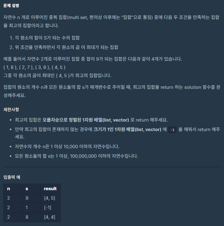 (프로그래머스 c++)최고의 집합 본문