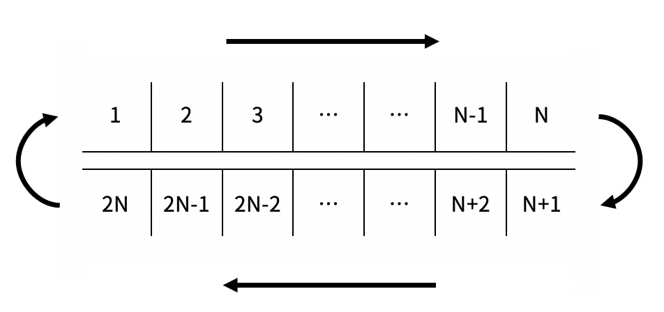 길이가 N인 컨베이어 벨트가 있고, 길이가 2N인 벨트가 이 컨베이어 벨트를 위아래로 감싸며 돌고 있다. 벨트는 길이 1 간격으로 2N개의 칸으로 나뉘어져 있으며, 각 칸에는 아래 그림과 같이 1부터 2N까지의 번호가 매겨져 있다.